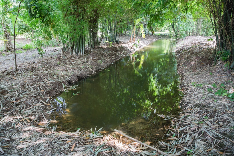 แบ่งผืนดินในบ้านขุด “หนอง” ให้เป็นแหล่งเก็บน้ำและที่อาศัยของปลา มีผักบุ้งผักกระเฉดเป็นแหล่งอาหารของคน