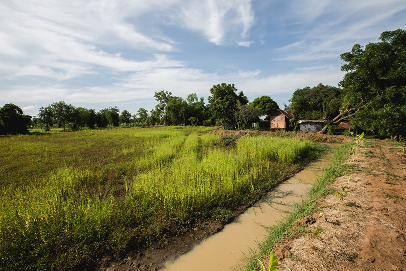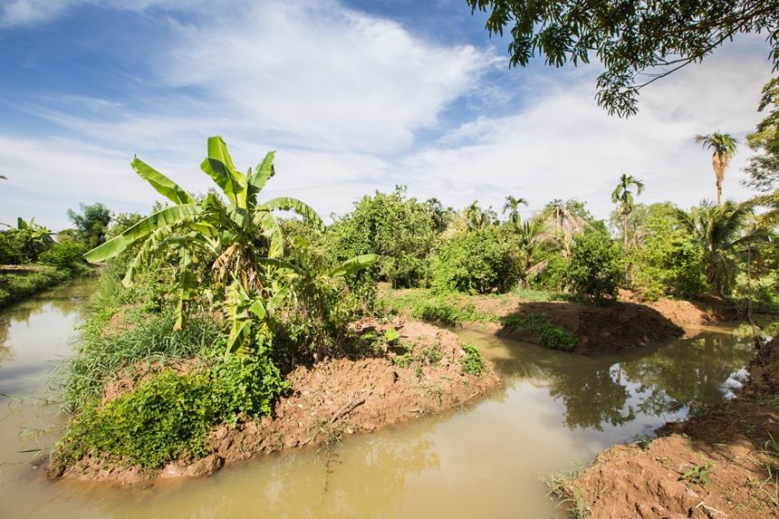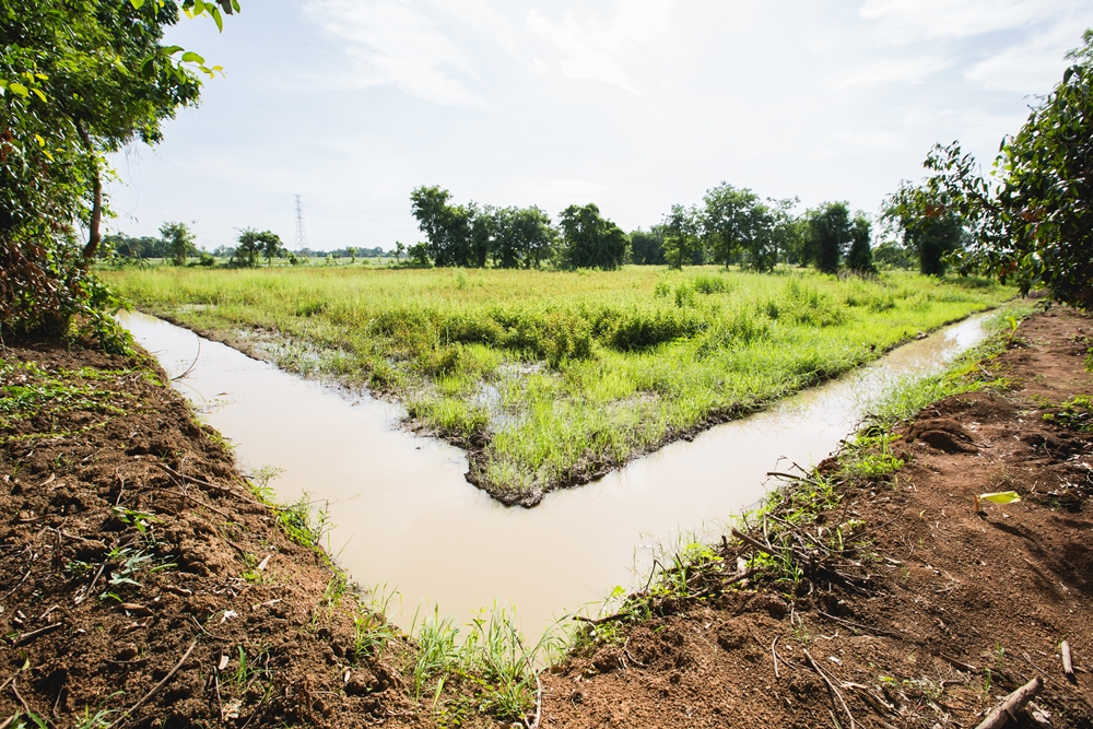 เมื่อดินเหลือจึงใช้เสริมคัน “นา” กักน้ำไม่ให้นาข้าวแห้ง ยามน้ำหลากยังรับน้ำไว้ให้พืชผักบนโคกปลอดภัย