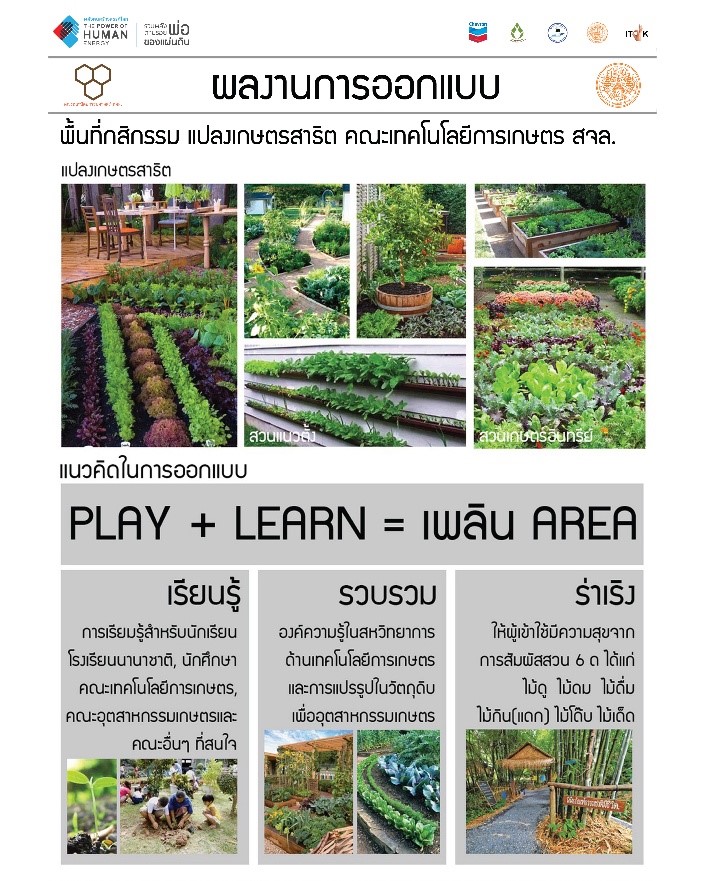 กิจกรรมเอามื้อสามัคคีที่พื้นที่กสิกรรม แปลงเกษตรสาธิต คณะเทคโนโลยีการเกษตร ได้ออกแบบและปรับปรุง เพื่อสร้างพื้นที่ให้เป็นแหล่งเรียนรู้สำหรับการทำเกษตรในเมืองแก่ประชาชนต่อไปในอนาคต นอกจากนั้น ยังสนับสนุนให้นักศึกษาได้เรียนรู้และลงมือปฏิบัติจริง ภายใต้แนวคิด Play + Learn = เพลิน area