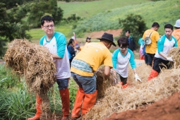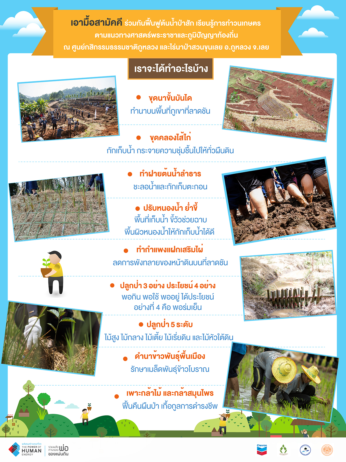 กิจกรรมเอามื้อสามัคคีที่ไร่นาป่าสวนขุนเลย คือ ขุดนาขั้นบันได ขุดคลองไส้ไก่ ทำแฝกเสริมไผ่ ปลูกป่า 3 อย่าง ประโยชน์ 4 อย่าง ดำนาปลูกข้าวเหนียวพันธุ์พื้นเมือง “แดงเมืองเลย”