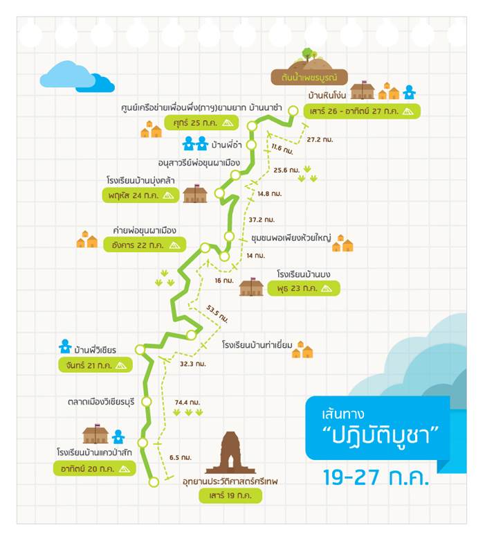 เดินทางจากโรงเรียนบ้านบึงตะแบก ต.หนองแจง อ.บึงสามพัน จ.เพชรบูรณ์ แวะทำกิจกรรมที่โรงเรียนบ้านท่าเยี่ยม ต.ท่าแดง อ.หนองไผ่ จ.เพชรบูรณ์ ถึง ค่ายพ่อขุนผาเมือง ต.สะเดียง อ.เมือง จ.เพชรบูรณ์ ระยะทาง 85.8 กิโลเมตร