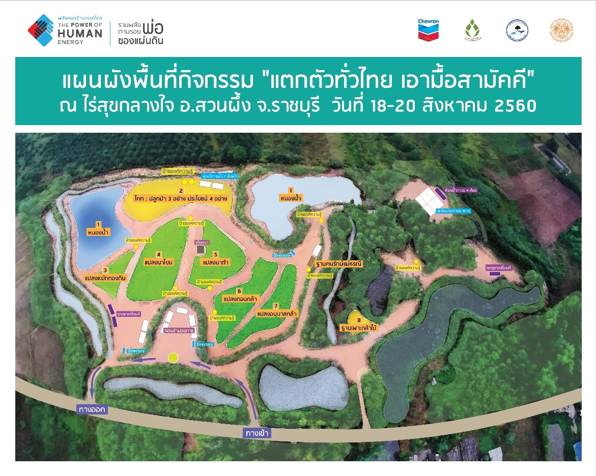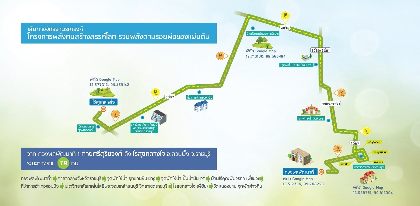 เพื่อสร้างพื้นที่เรียนรู้ตามรอยศาสตร์พระราชาที่ไร่สุขกลางใจของ สุขะชัย ศุภศิริ (ครูชัย) หนึ่งในเครือข่ายลุ่มน้ำแม่กลอง ซึ่งเป็นตัวแทนกลุ่มคนเมืองที่ต้องการมาทำตามรอยพ่อ โดยมีกิจกรรมหลัก คือ การทำนาธรรมชาติ และการสร้างความอุดมสมบูรณ์ให้พื้นที่ พร้อมกันนั้น ยังมีกิจกรรมปั่นรณรงค์รอบเมืองราชบุรี เพื่อสร้างแรงบันดาลใจสู่การเรียนรู้วิถีพอเพียงตามรอยพ่อ จากกองพลพัฒนาที่ 1 ค่ายศรีสุริยวงศ์ ถึงไร่สุขกลางใจ อ.สวนผึ้ง จ.ราชบุรี ระยะทางรวม 79 กิโลเมตร โดยมีเครือข่ายนักปั่นสะพานบุญ นักปั่นทหารจากค่ายศรีสุริยวงศ์ และนักปั่นในพื้นที่ และนักปั่นเชฟรอน กิจกรรมปั่นจักรยานรณรงค์