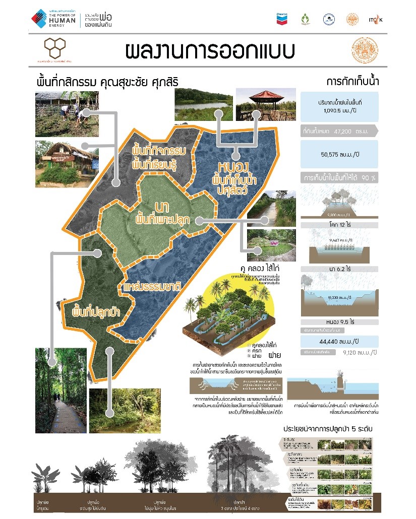 - เพิ่มความสมบูรณ์ให้พื้นที่ ด้วยธนาคารกล้าไม้ ปลูกป่า 3 อย่าง ประโยชน์ 4 อย่าง และรักษาความชุ่มชื้นด้วยการห่มดิน แห้งชาม น้ำชาม (ปุ๋ยแห้ง ปุ๋ยน้ำ) ด้วยแนวคิดการเลี้ยงดินให้ดินเลี้ยงพืช
