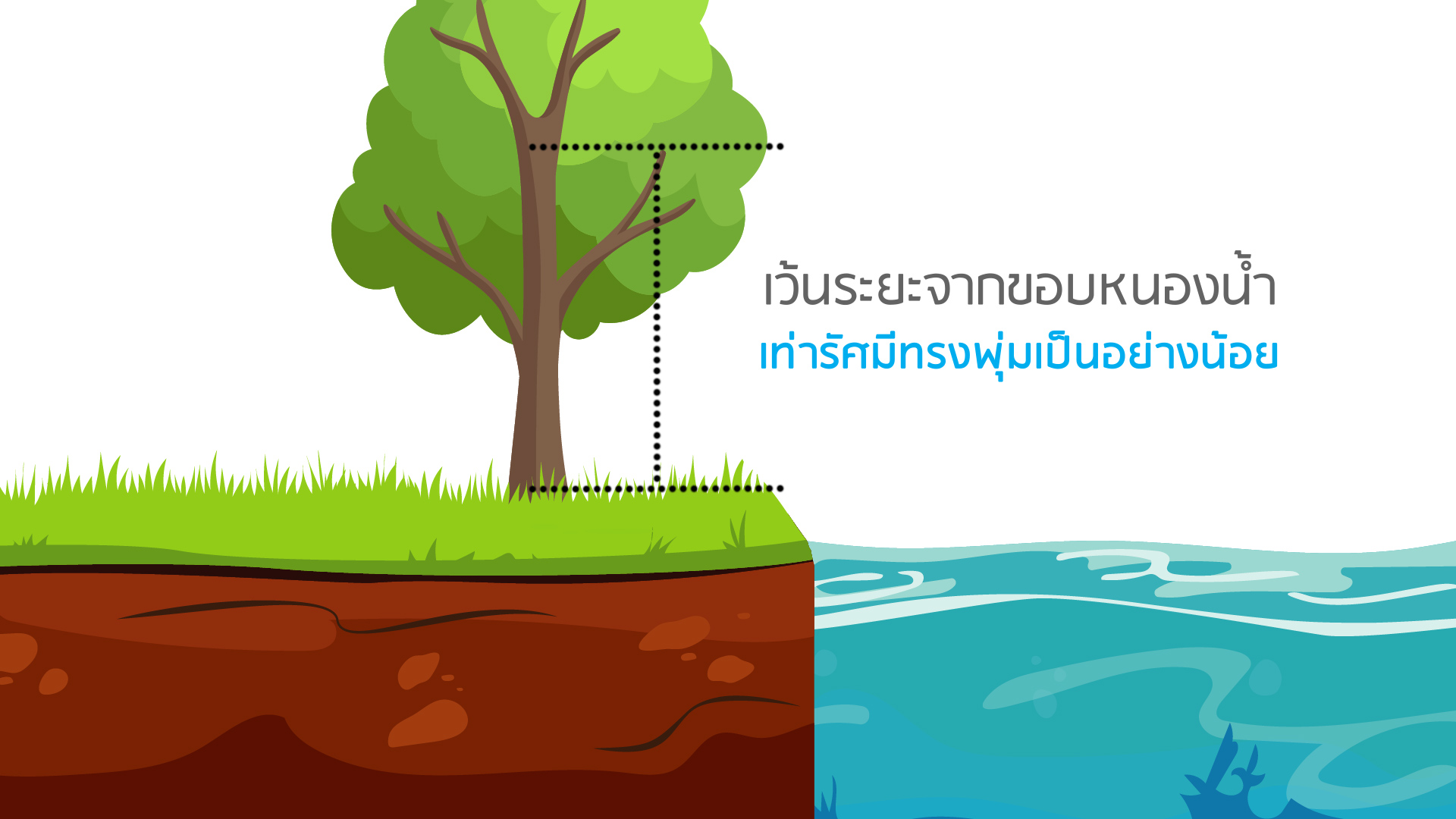 การปลูกไม้ใหญ่ หรือไม้กลางไว้ใกล้น้ำ หากปลูกต้นไม้ริมหนองน้ำ ด้านที่ติดกับหนองน้ำจะเอนไปหาหาน้ำเพราะรากต้นไม้เจริญเติบโตไปทางหนองน้ำไม่ได้ รากและทรงพุ่มรับน้ำหนักไม่ได้ ต้นไม้ใหญ่ที่ปลูกริมหนองน้ำจะค่อยๆ เอนไปหาหนองน้ำ นอกจากนี้ การปลูกไม้ผลริมหนองน้ำ ทรงพุ่มด้านที่ติดกับหนองน้ำจะทำให้ตัดแต่งกิ่งลำบาก และเก็บเกี่ยวผลผลิตยาก หากต้องการปลูกไว้ริมน้ำจึงควรเว้นระยะร่น โดยเว้นระยะจากขอบหนองน้ำเท่ากับรัศมีทรงพุ่มเป็นอย่างน้อย หรือไปปลูกข้างคลองไส้ไก่ซึ่งไม่ได้มีความลึกมาก รากของพืชสามารถแผ่ไปใต้คลองไส้ไก่ได้