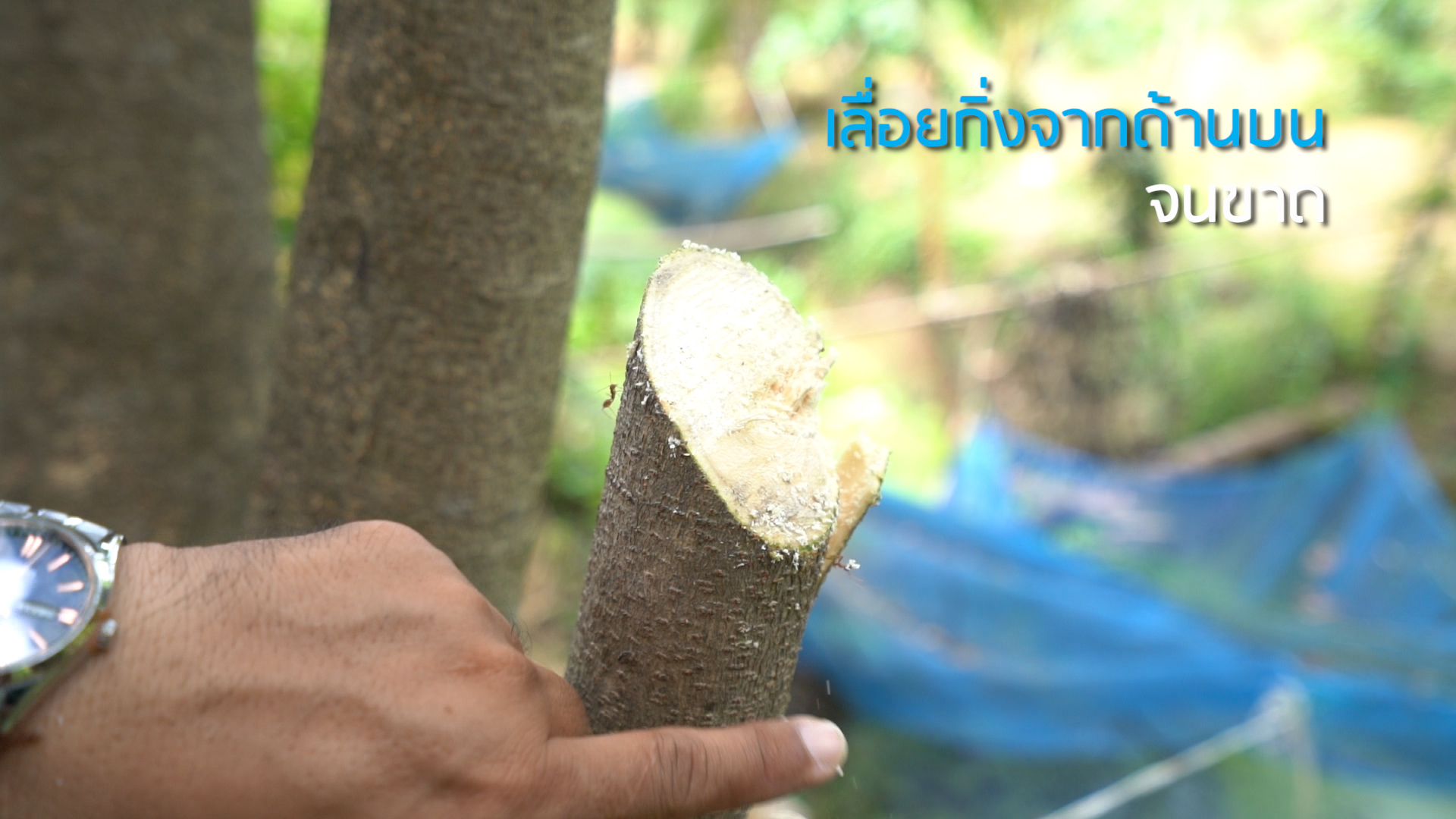 หากกิ่งไม้ใหญ่มาก ให้ผูกเชือกเพื่อพยุงกิ่งที่จะตัด เพื่อป้องกันกิ่งไม้หักลงมาเป็นอันตรายได้