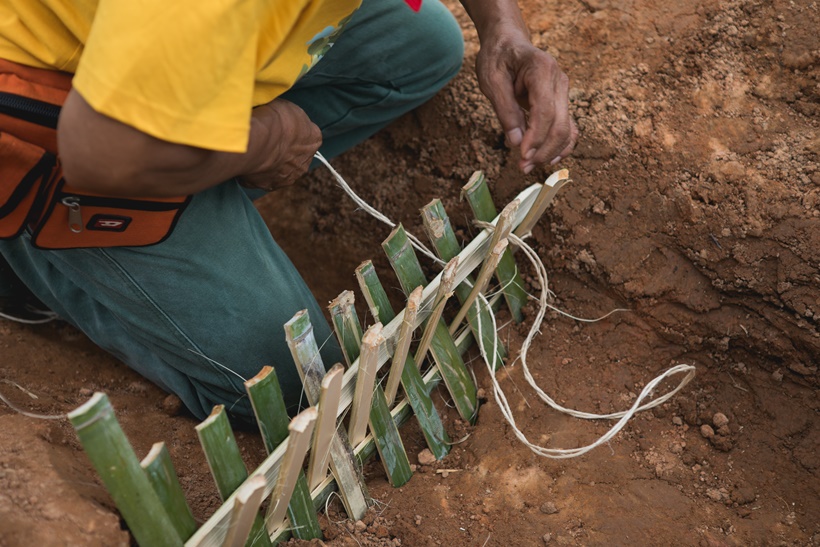 ให้ขุดเป็นร่องโดยมีความกว้างและความลึก 50 เซนติเมตร โดยนำดินที่ได้จากการขุดขึ้นมาถมในฝั่งตรงข้ามของแหล่งน้ำที่ไหลมา ทำคันดินให้กว้าง 1 เมตร แล้วปลูกแฝกเพื่อลดการพังทลายของคันดิน ปลูกไม้ผล และผักสวนครัวไว้เป็นแหล่งอาหาร