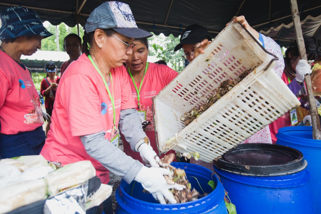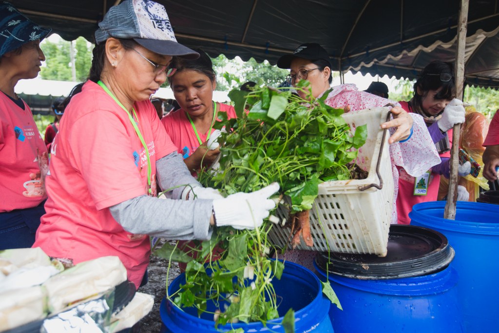 - นำเศษผักผลไม้สับให้เป็นชิ้นเล็ก ๆ ใส่ในถังพลาสติก