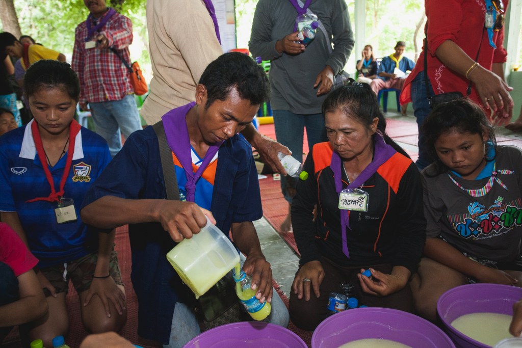- นำน้ำขี้เถ้าที่ได้ปริมาณ 5 ลิตร มาผสมกับน้ำยาที่เตรียมไว้ (ลดปริมาตรน้ำสะอาดที่เติมจาก 8 ลิตร เป็น 3 ลิตร)