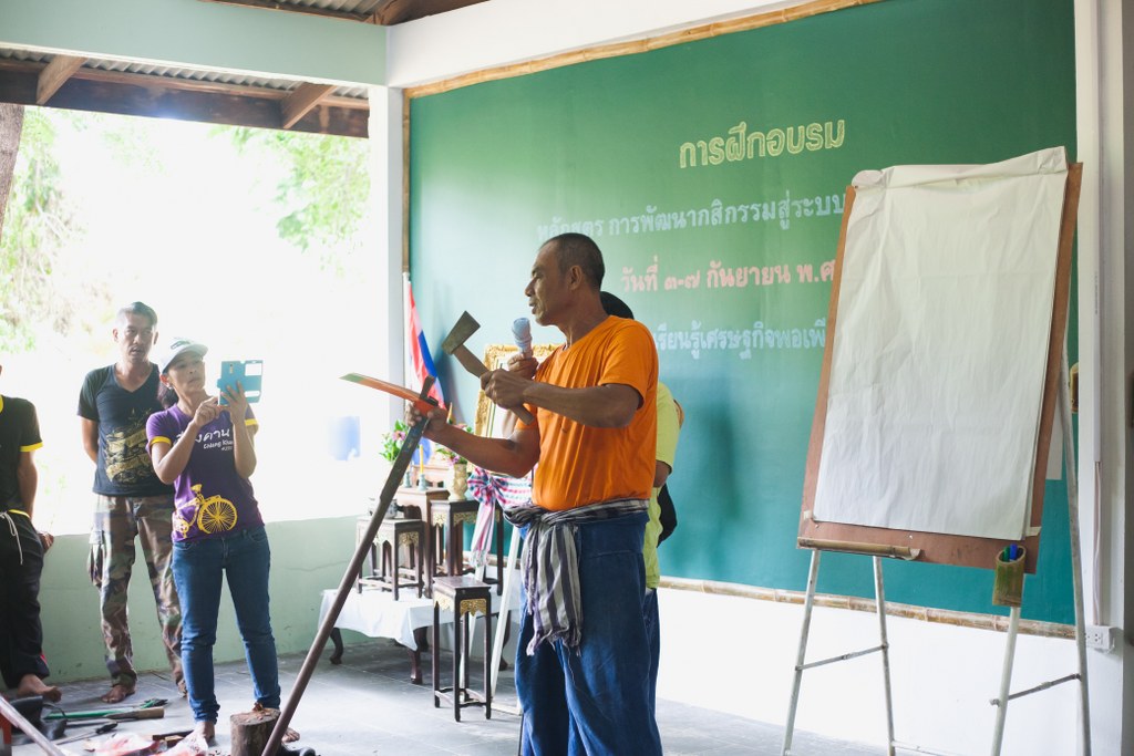 กำนันเคว็ดหรือนายประวิทย์ ภูมิระวิ เครือข่ายกสิกรรมธรรมชาติ จ.ชุมพร เคยมาให้ความรู้และสาธิตเรื่องจอบเอาไว้ เมื่อครั้งที่เรามาทำกิจกรรมโครงการฯ ในปีที่ 4 (พ.ศ.2559) ณ ศูนย์การเรียนรู้เศรษฐกิจพอเพียงชุมชน หน่วยบัญชาการสงครามพิเศษ (วัดใหม่เอราวัณ) จ.ลพบุรี