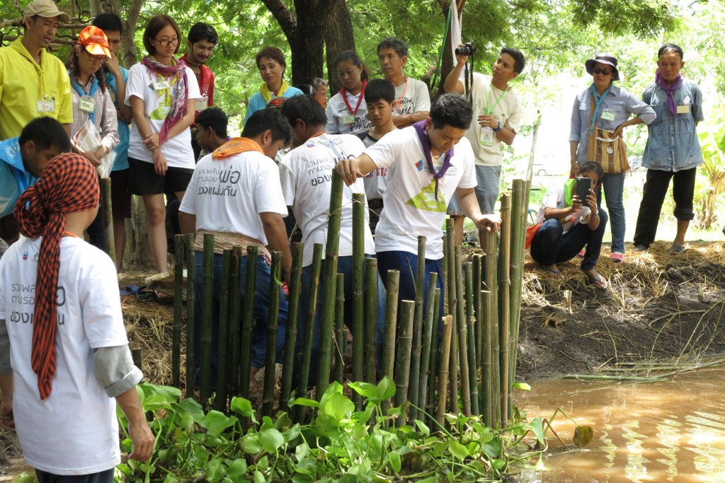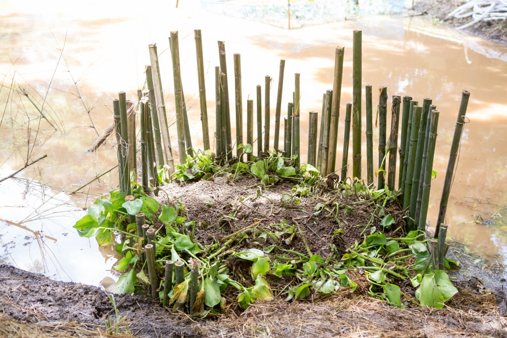2. แซนด์วิชปลาแบบเสวียน โดยนำไม้ไผ่มาเหลาเป็นซี่แล้วปักรอบ ๆ แล้วสานเหมือนสานเข่ง โดยสานให้มีช่องห่างกัน 1 ฝ่ามือ สลับกับช่องว่าง 1 นิ้ว เพื่อให้ปลาสามารถมาตอดกินอาหารและสร้างความแข็งแรงให้เสวียน นำไปไว้ริมหนองน้ำ