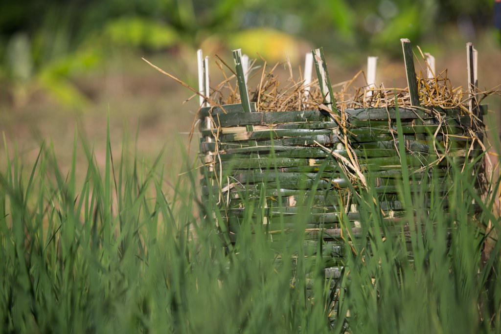 2. เมื่อมีไม้ไผ่หรือเสวียนเป็นเสมือนภาชนะแล้ว จึงใส่ฟาง ผักตบชวา หรือใบไม้สุมลงไปให้มีความสูง 1 ฟุต หรือ 1 ศอก ย่ำให้แน่น ใส่ปุ๋ยคอก และรดน้ำหมักจุลินทรีย์ชีวภาพ โดยทำสลับกับเป็นชั้น ๆ จนเต็มคอกหรือเสวียน