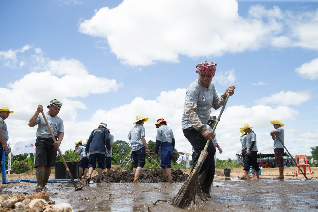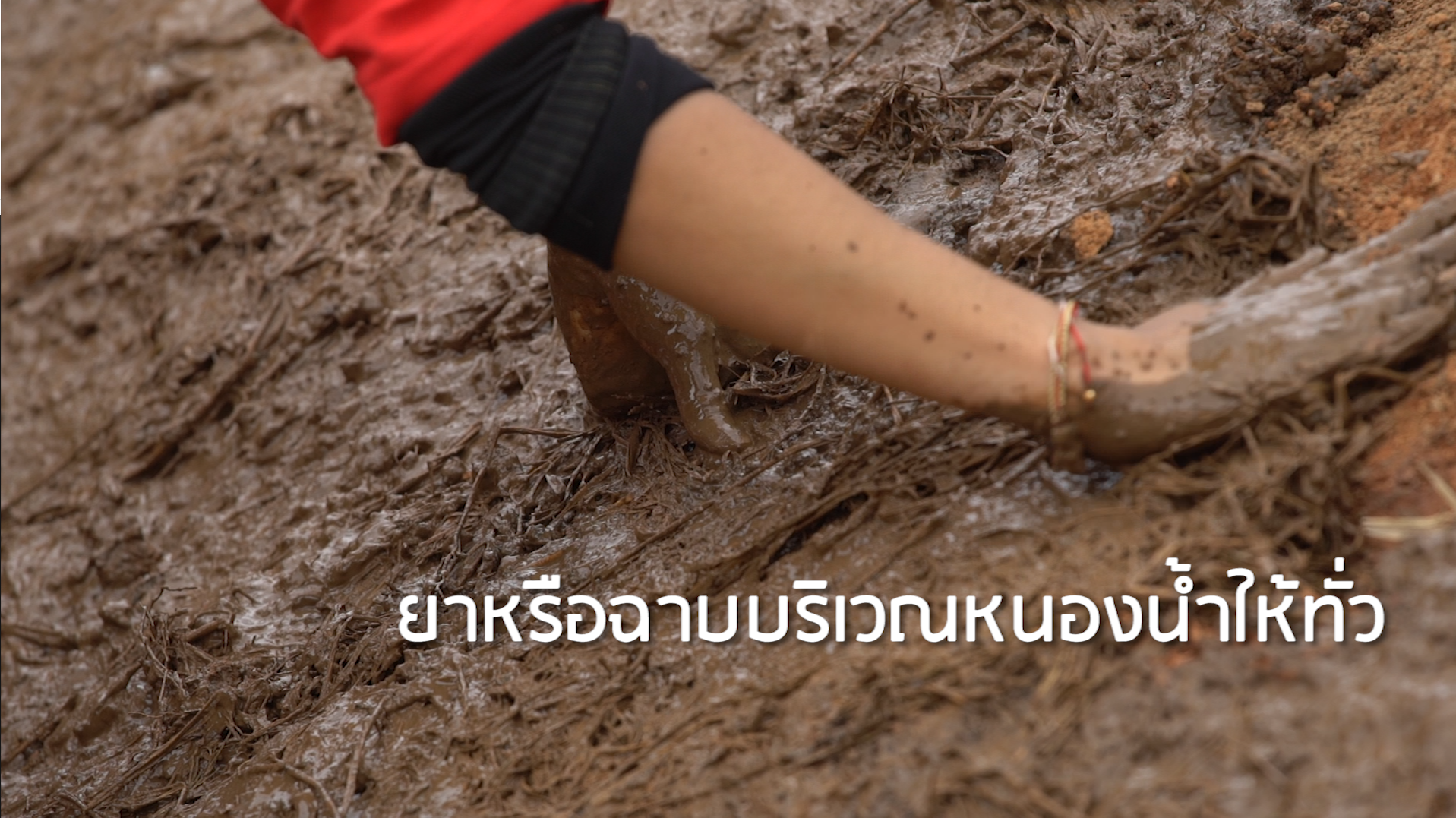 2. นำส่วนผสมที่ผสมเข้ากันดีแล้วยาหรือฉาบบริเวณผนังและก้นหนองน้ำให้ทั่ว โดยยาหรือฉาบจากก้นหนองขึ้นไปจนถึงขอบหนอง แล้วยาปิดขอบหนองน้ำให้สนิท เพื่อป้องกันการชะล้างเมื่อฝนตก