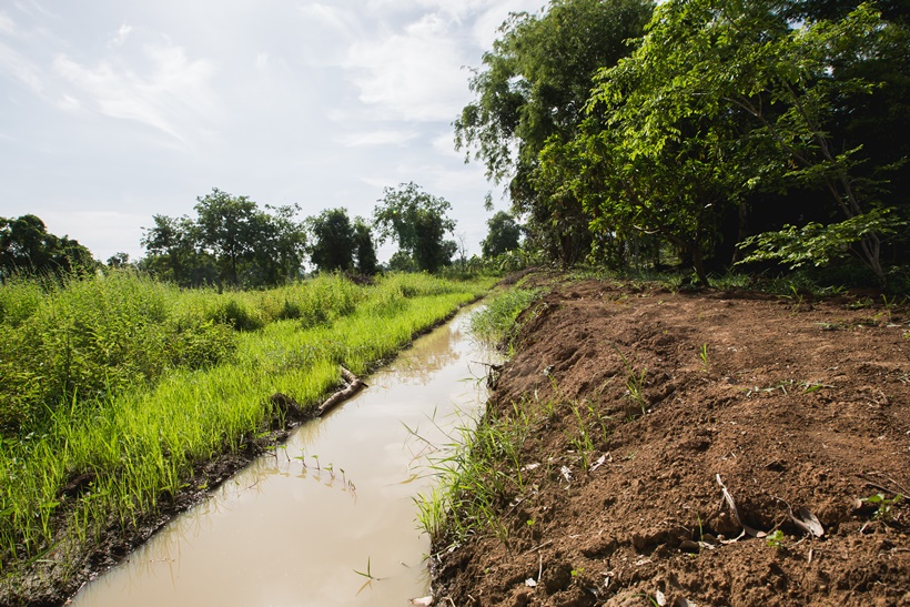 เมื่อดินเหลือจึงใช้เสริมคัน “นา” กักน้ำไม่ให้นาข้าวแห้ง ยามน้ำหลากยังรับน้ำไว้ให้พืชผักบนโคกปลอดภัย