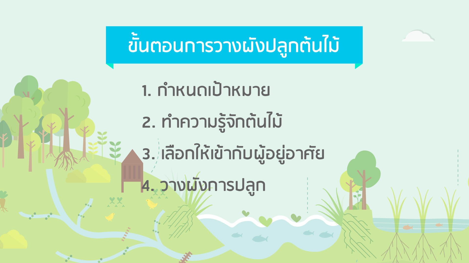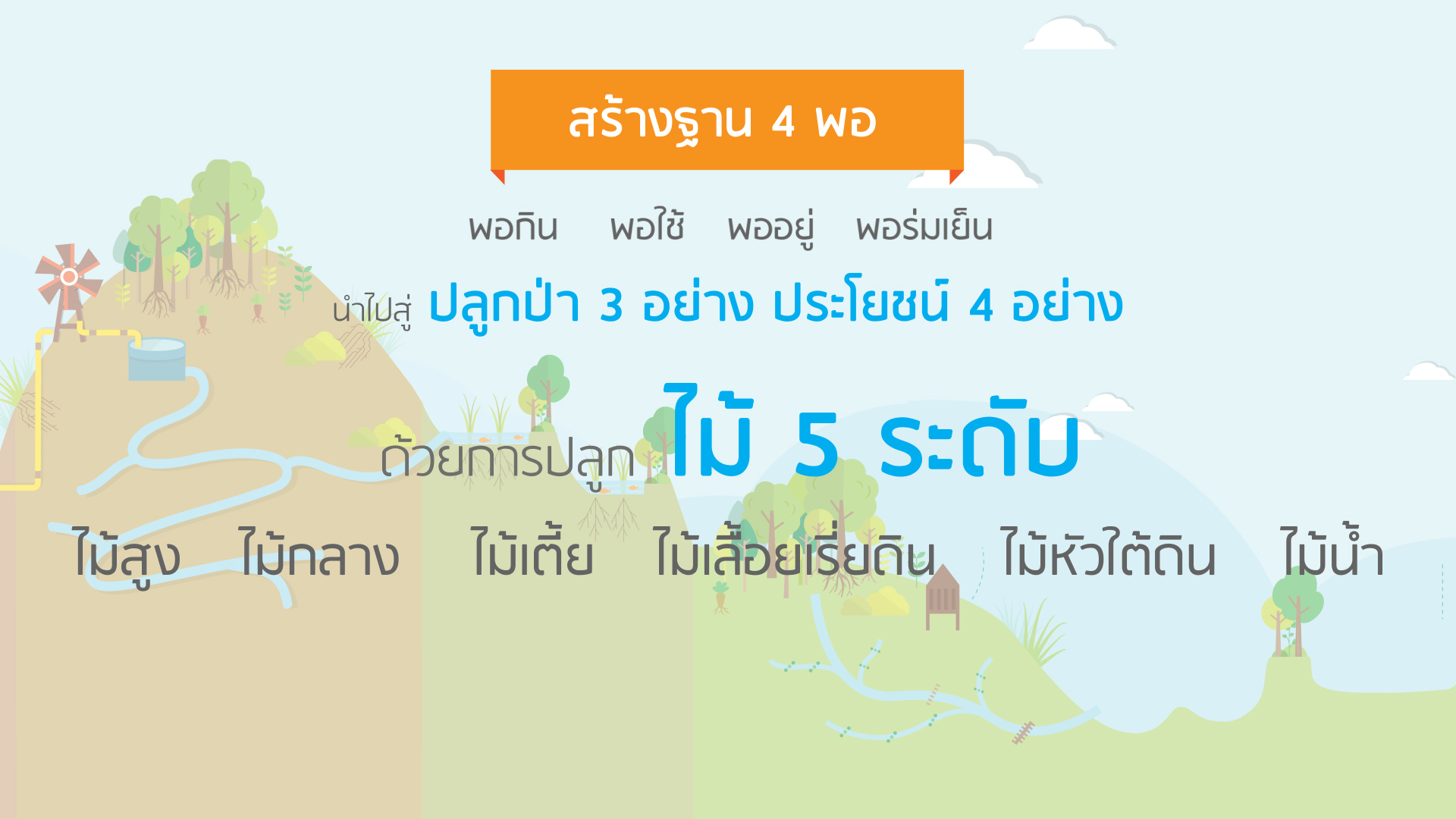 ตามวิถีกสิกรรมธรรมชาติ แนะนำให้ปลูกป่า 5 ระดับ และไม้น้ำ เพื่อสร้างระบบนิเวศที่อุดมสมบูรณ์ให้เกิดขึ้นในพื้นที่ของเรา ซึ่งไม่ใช่ปลูกให้มากที่สุด แน่นที่สุด รกที่สุด แต่เป็นการปลูกที่เหมาะสม เราจึงจำเป็นต้องวางแผน จัดระเบียบ และบริหารจัดการ ให้เราสามารถเข้าถึงและดูแลให้ต้นไม้ทุกต้นที่เราปลูกให้เจริญเติบโตและทำหน้าที่ได้อย่างเต็มที่ตลอดอายุขัยของต้นไม้เหล่านั้น