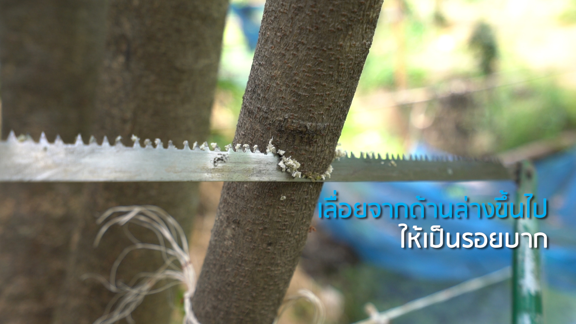 การตัดกิ่งใหญ่จะใช้เลื่อยโดยวางเลื่อยจากด้านล่างขึ้นไป เลื่อยให้เป็นรอยบาก จากนั้นจึงเลื่อยด้านบนจนขาด วิธีแบบนี้จะทำให้กิ่งไม่ฉีกขาดเกิดแผลและน้ำยางจะสามารถไหลออกได้